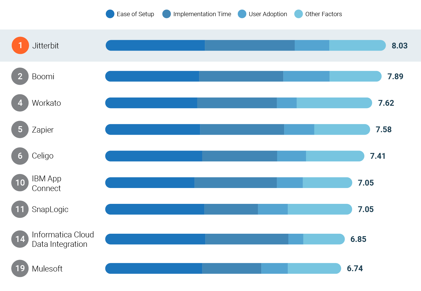 Our leadership isn’t limited to integration. Jitterbit App Builder was recognized as a top performer, ranking No. 2 in the Enterprise Implementation Index for Low-Code Development Platforms.