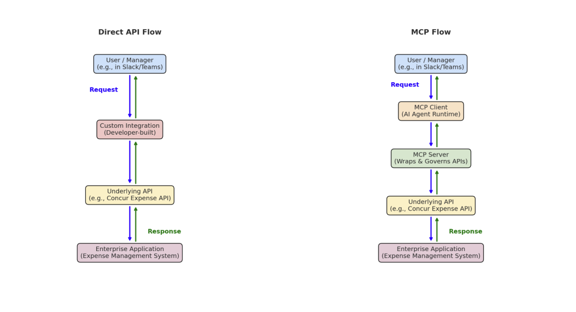 Here’s what happens: The AI agent in Slack interprets the request. It needs to talk to Concur to get data or perform an action. Traditionally, it would hit the Concur APIs directly — but without strong safeguards, that could mean over-permissioning, lack of logging or unsafe automation.