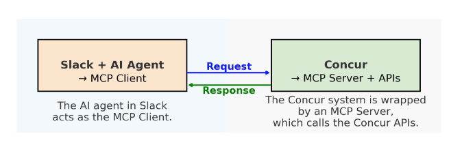 The MCP client (running inside Slack with the AI agent) sends the request. The MCP server (sitting close to Concur) wraps the Concur APIs, checking permissions, adding governance and logging actions. Only then does the API call get executed by Concur.